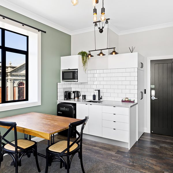 Chief MacFarlane is a well-appointed apartment with lots of natural light and a view across Hokitika township. Decorated in muted sage green and warm white, the studio feels clean and spacious with more than a touch of luxury.
